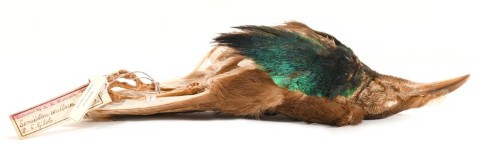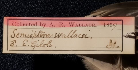 On his return to the UK, Wallace was confronted with a mammoth unpacking task. He was surrounded by crates containing some 3,000 bird skins and 20,000 butterflies and beetles that had to be sorted, classified, and either sold or put aside for his personal collection. The tray of beetles shown above are from Wallace’s private collection. The bird skin, label, and illustration shown is Semioptera wallacii, a bird of paradise that is one of the roughly 5,000 birds said to have been collected by Ali and is the object of his statement when he presented the dead bird to Wallace: “Look here, sir, what a curious bird.”
